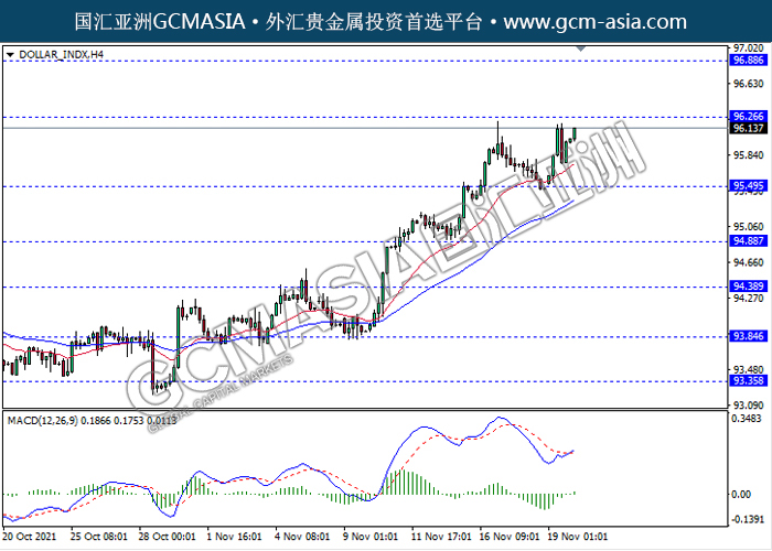 20211122 DOLLAR_INDX-午间 by willy | Nov 22, 2021 | 美元指数 | 0 comments DOLLAR_INDX,H4:美指多头排列,目前测试靠近前期压力。MACD形成金叉,动能略增,若突破可继续看多为主。上方关注96.25压力和96.90压力,下方关注95.50支撑和94.90支撑。