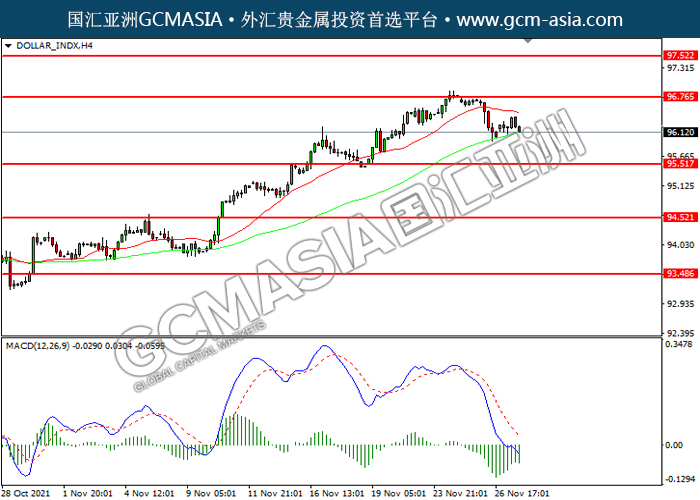 20211130 DOLLAR_INDX by willy | Nov 30, 2021 | 美元指数 | 0 comments DOLLAR_INDX,H4:美指震荡下行。MACD空头动能略增,短期可关注空头为主。上方关96.75压力和97.50压力,下方关注95.50支撑和94.50支撑。