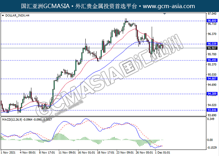 20211202 DOLLAR_INDX-午间 by keyk | Dec 2, 2021 | 美元指数 | 0 comments DOLLAR_INDX,H4:美指震荡盘整,目前测试靠近前期压力。然而,MACD形成金叉,动能略增,若突破可关注多头方向为主。上方关注96.05压力和96.80压力,下方关注95.50支撑和94.90支撑。