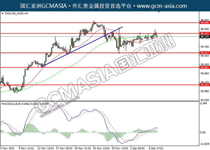20211208 DOLLAR_INDX by willy | Dec 8, 2021 | 美元指数 | 0 comments DOLLAR_INDX,H4:美指震荡上行,目前测试前期压力。然而,MACD多头动能略减,短期可关注技术性回调为主。上方关96.35压力和96.80压力,下方关注95.50支撑和94.90支撑。