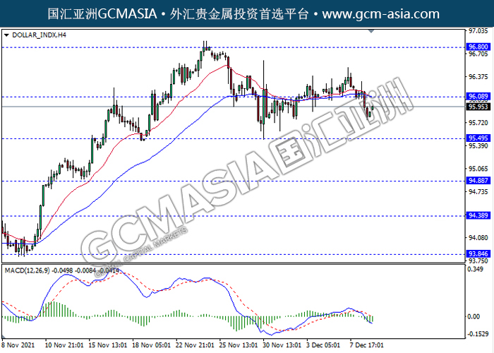 DOLLAR_INDX,H4:美指突破前期支撑,空头排列。MACD形成死叉,动能略减,短期继续看空为主。上方关注96.80压力和97.60压力,下方关注96.05支撑和95.50支撑。