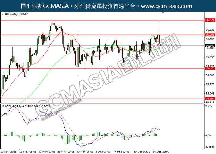 20211216 DOLLAR_INDX by willy | Dec 16, 2021 | 美元指数 | 0 comments DOLLAR_INDX,H4:美指高位回落。MACD多头动能略减,短期可关注空头为主。上方关96.50压力和96.85压力,下方关注95.70支撑和94.90支撑。