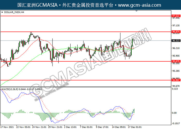 20211220 DOLLAR_INDX-午间 by willy | Dec 20, 2021 | 美元指数 | 0 comments DOLLAR_INDX,H4:美指低位反弹。MACD多头动能略增,短期可关注多头为主。上方关96.85压力和97.50压力,下方关注95.65支撑和94.90支撑。