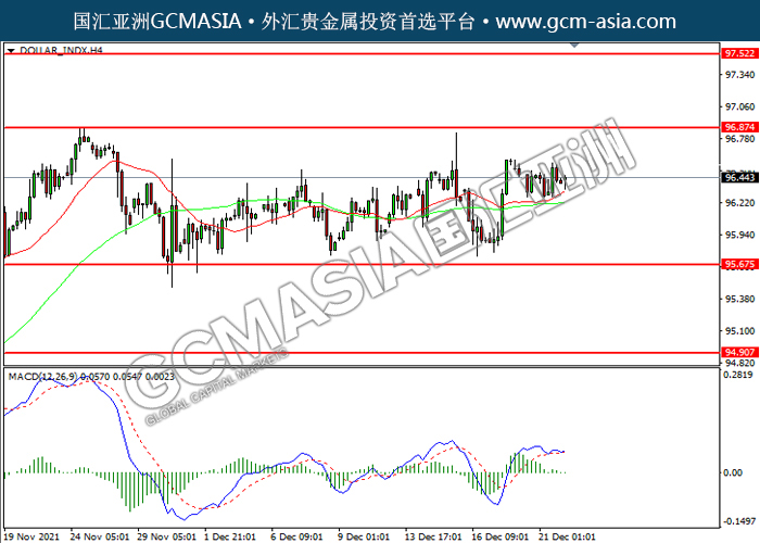 20211222 DOLLAR_INDX-午间 by willy | Dec 22, 2021 | 美元指数 | 0 comments DOLLAR_INDX,H4:美指低位反弹。然而,MACD多头动能略减,短期可关注技术性回调为主。上方关96.85压力和97.50压力,下方关注95.65支撑和94.90支撑。