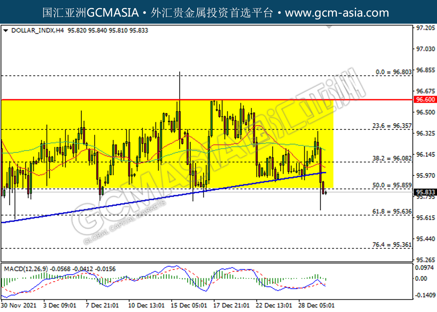 20211230 DOLLARINDX by willy | Dec 30, 2021 | 美元指数 | 0 comments DOLLAR_INDX,H4:美指震荡下行。MACD已形成死叉,动能偏弱,短期关注空头为主。上方关注95.85压力和96.10压力,下方关注95.65支撑和95.35支撑。