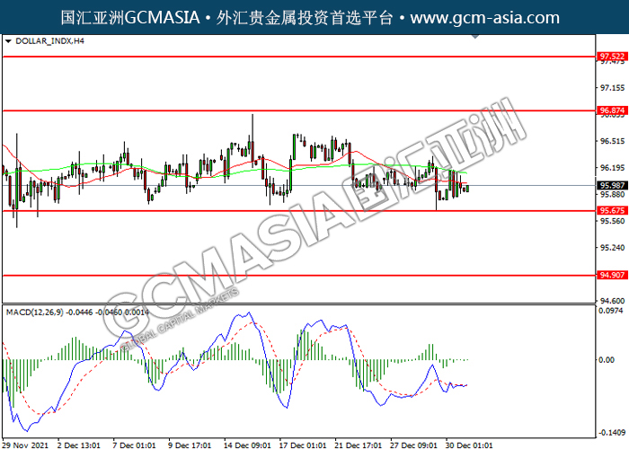 20211231 DOLLAR_INDX-午间 by willy | Dec 31, 2021 | 美元指数 | 0 comments DOLLAR_INDX,H4:美指高位回落,目前测试前期支撑。MACD空头动能略增,若下破可关注空头为主。上方关96.85压力和97.50压力,下方关注95.65支撑和94.90支撑。