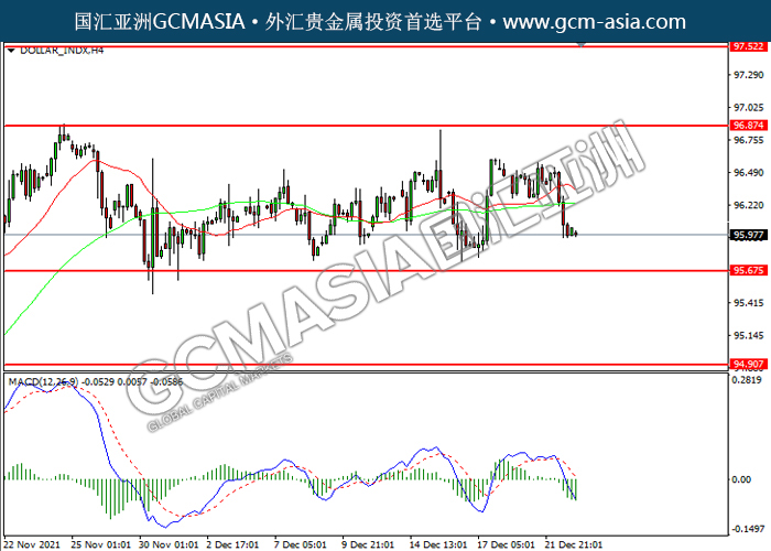 2021223 DOLLAR_INDX-午间 by willy | Dec 23, 2021 | 美元指数 | 0 comments DOLLAR_INDX,H4:美指高位回落。MACD空头动能略增,短期可关注空头为主。上方关96.85压力和97.50压力,下方关注95.65支撑和94.90支撑。