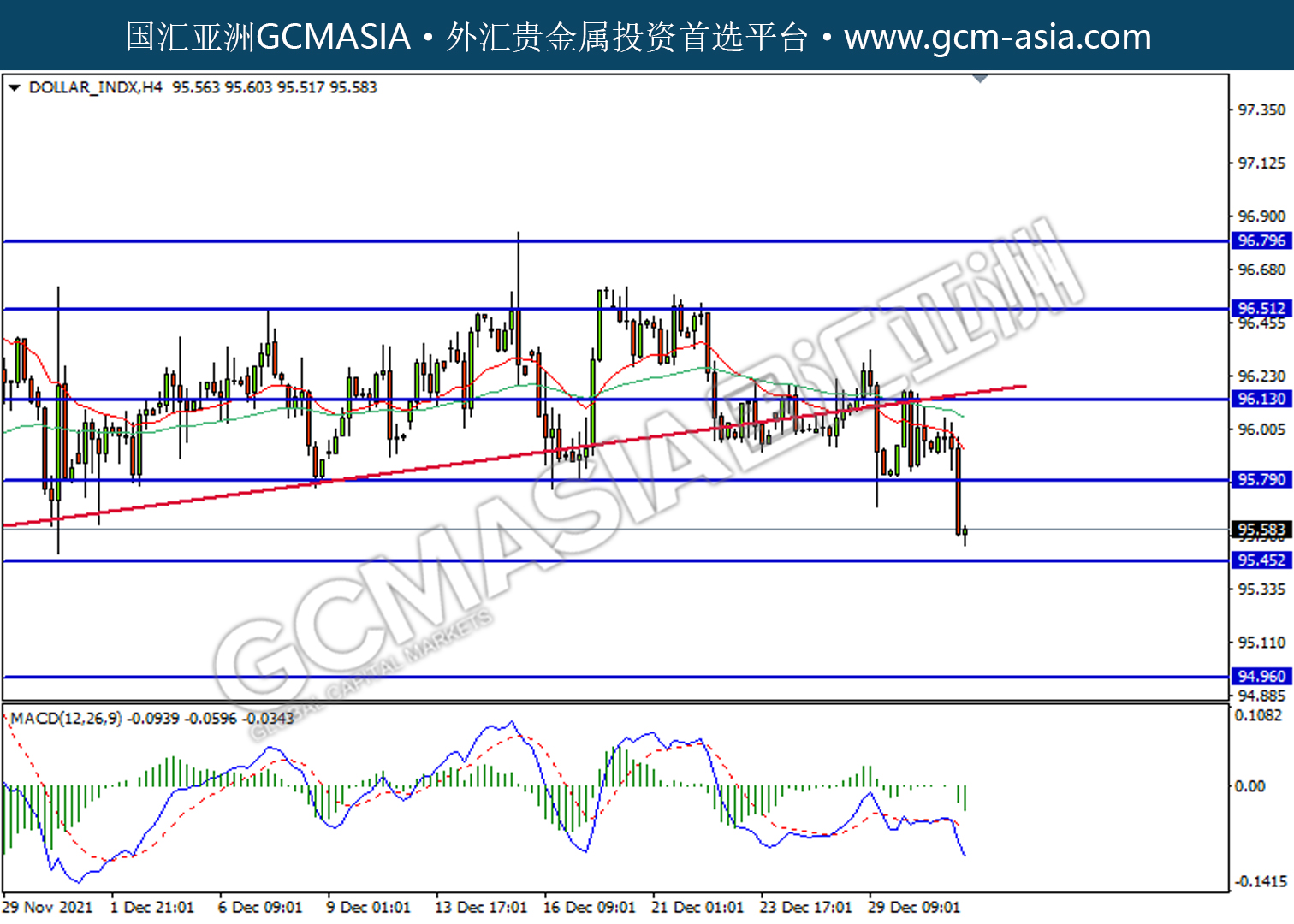 20220103 DOLLAR_INDX by willy | Jan 3, 2022 | 美元指数 | 0 comments DOLLAR_INDX,H4:美指震荡下行。MACD已形成死叉,动能偏弱,短期关注空头为主。上方关注95.80压力和96.15压力,下方关注95.45支撑和94.95支撑。