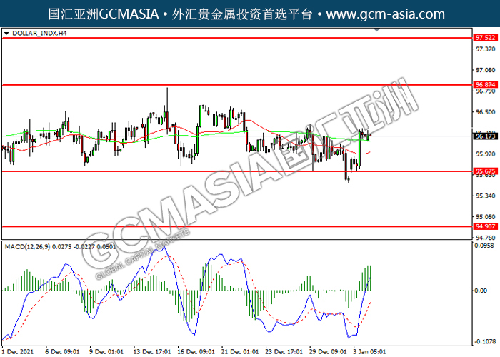 20220104 DOLLAR_INDX-午间 by willy | Jan 4, 2022 | 美元指数 | 0 comments DOLLAR_INDX,H4:美指低位反弹。MACD多头动能略增,短期可关注多头为主。上方关96.85压力和97.50压力,下方关注95.65支撑和94.90支撑。