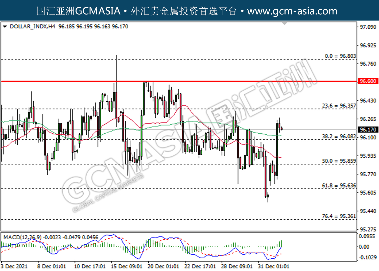 20220104 DOLLARINDX by willy | Jan 4, 2022 | 美元指数 | 0 comments DOLLAR_INDX,H4:美指低位反弹。MACD已形成金叉,动能偏强,短期关注空头为主。上方关注96.35压力和96.60压力,下方关注96.10支撑和95.85支撑。