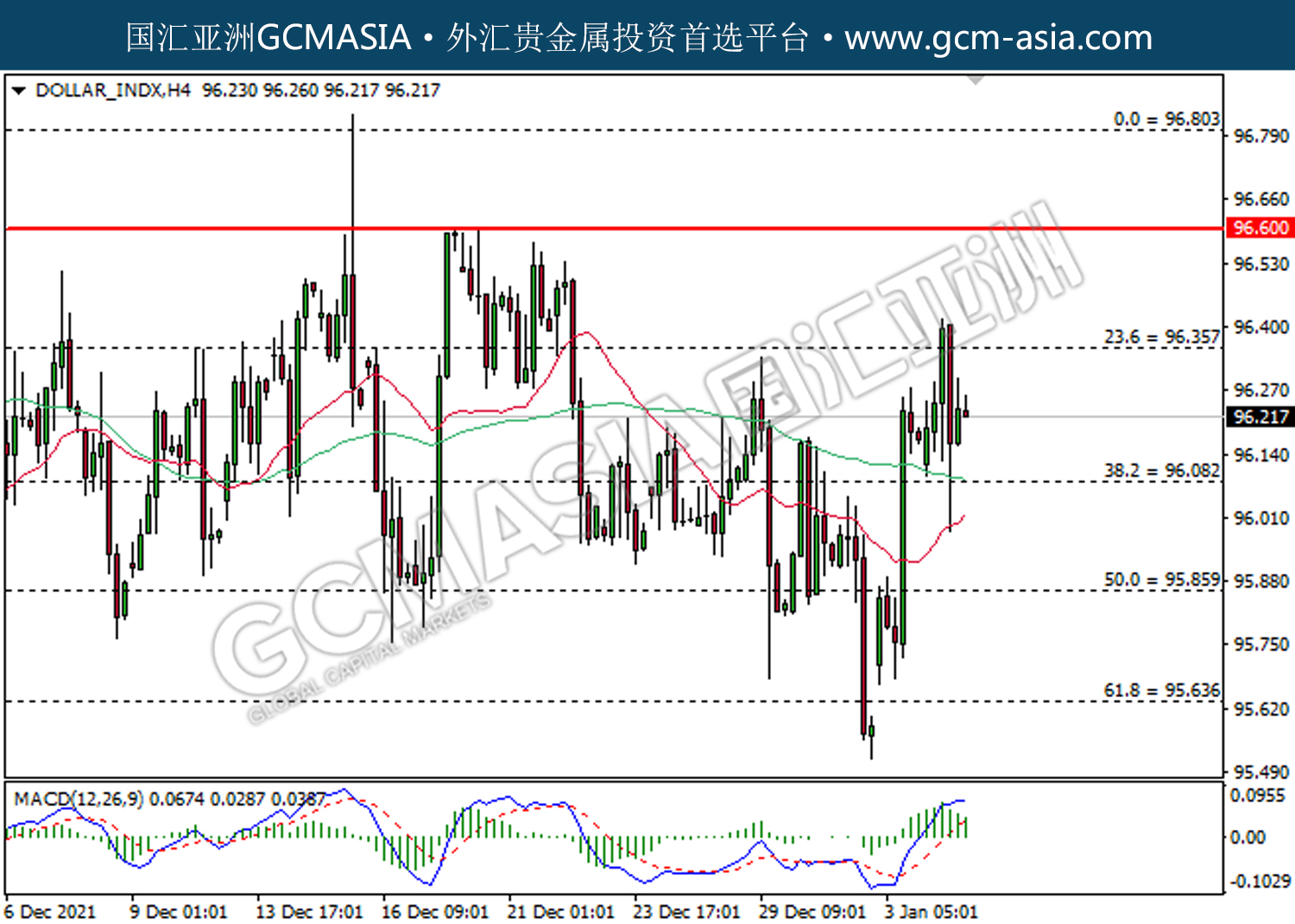 20220105 DOLLARINDX by willy | Jan 5, 2022 | 美元指数 | 0 comments DOLLAR_INDX,H4:美指受承压回落。MACD多头动能有所略减,短期关注空头势力。上方关注96.35压力和96.60压力,下方关注96.10支撑和95.85支撑。