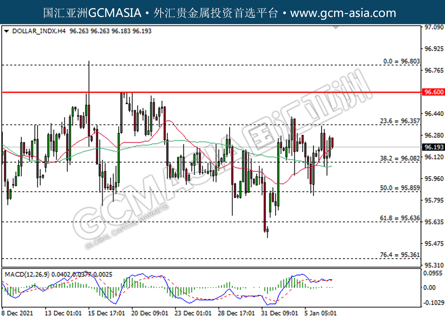 20220107 DOLLARINDX by willy | Jan 7, 2022 | 美元指数 | 0 comments DOLLAR_INDX,H4:美指受承压回落。MACD多头动能有所略减,短期关注空头为主。上方关注96.35压力和96.60压力,下方关注96.10支撑和95.85支撑。
