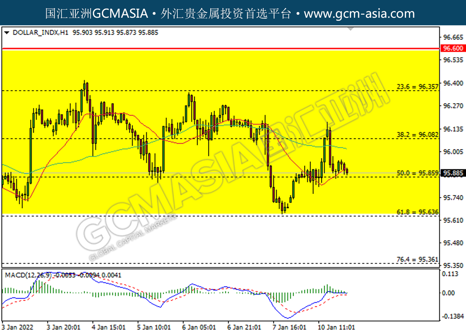 20220111 DOLLARINDX by willy | Jan 11, 2022 | 美元指数 | 0 comments DOLLAR_INDX,H1:美指受承压回落。MACD多头动能有所略减,若下破可继续看空。上方关注96.10压力和96.35压力,下方关注95.85支撑和95.65支撑。