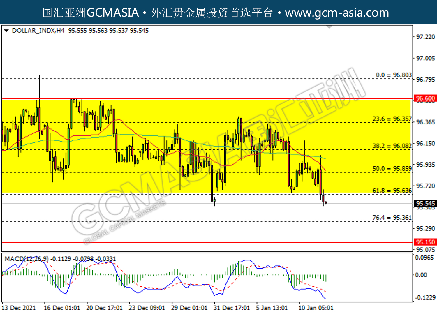 20220112 DOLLARINDX by willy | Jan 12, 2022 | 美元指数 | 0 comments DOLLAR_INDX,H4:美指受承压回落。MACD已形成死叉,动能偏弱,短期关注空头势力。上方关注95.65压力和95.85压力,下方关注95.35支撑和95.15支撑。