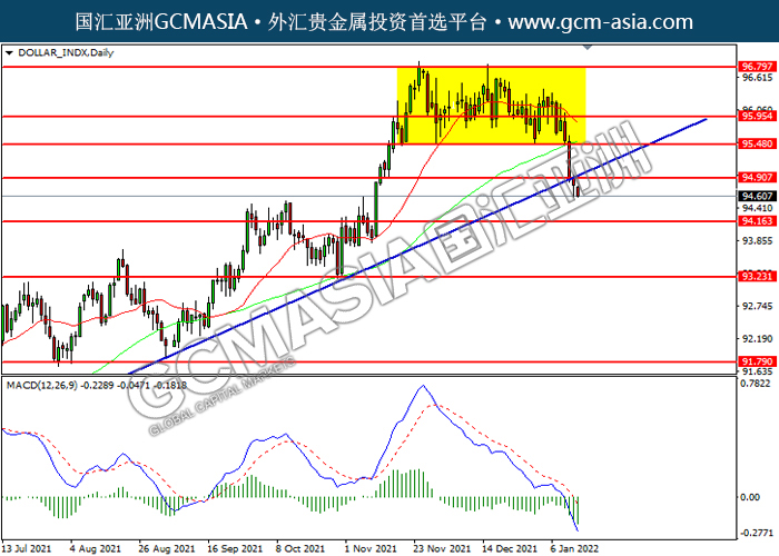 20220114 DOLLAR_INDX-午间 by willy | Jan 14, 2022 | 美元指数 | 0 comments DOLLAR_INDX,Daily:美指下破前期支撑,持续下行。MACD空头动能略增,短期可关注空头为主。上方关94.90压力和95.50压力,下方关注94.15支撑和93.25支撑。