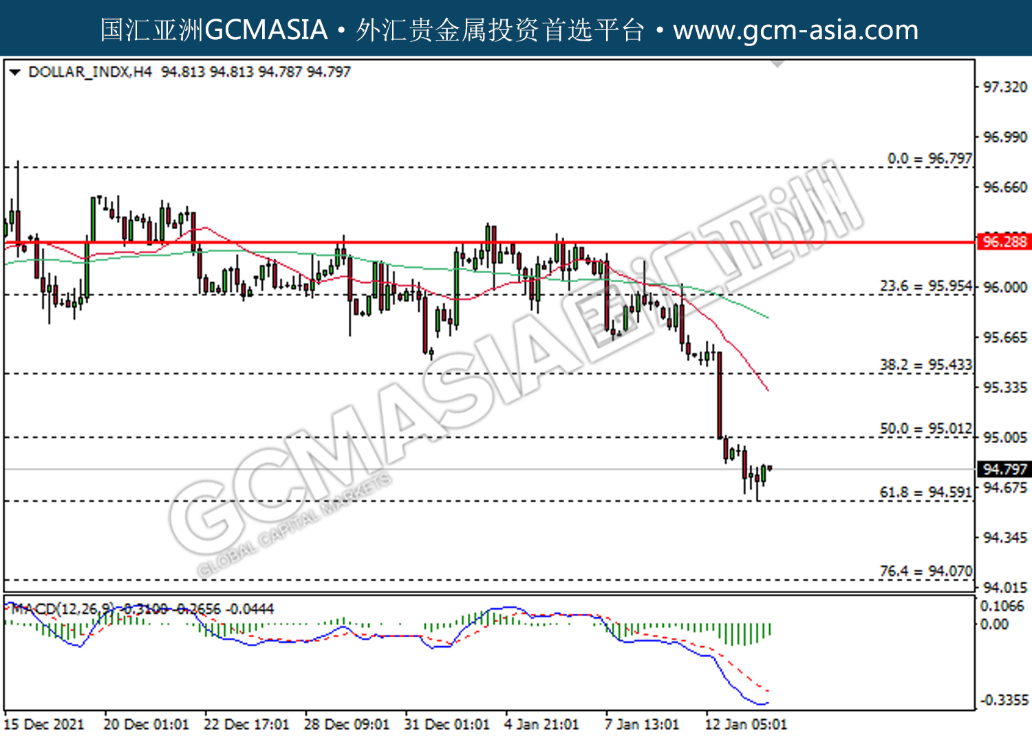20220114 DOLLARINDX by willy | Jan 14, 2022 | 美元指数 | 0 comments DOLLAR_INDX,H4:美指低位反弹。MACD空头动能有所略减,短期关注多头势力。上方关注95.00压力和95.45压力,下方关注94.60支撑和94.10支撑。