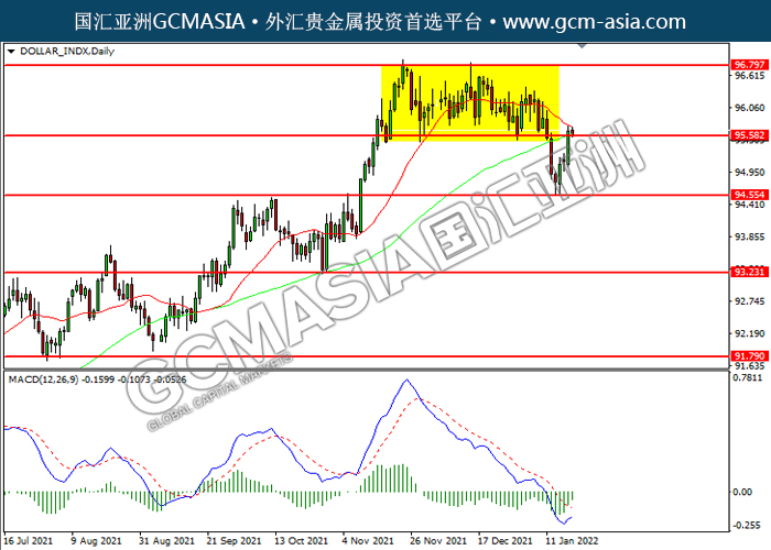 20220119 DOLLAR_INDX-午间 by willy | Jan 19, 2022 | 美元指数 | 0 comments DOLLAR_INDX,Daily:美指低位反弹,目前测试前期压力。MACD空头动能略减,短期可关注多头为主。上方关95.60压力和96.80压力,下方关注94.55支撑和93.25支撑。