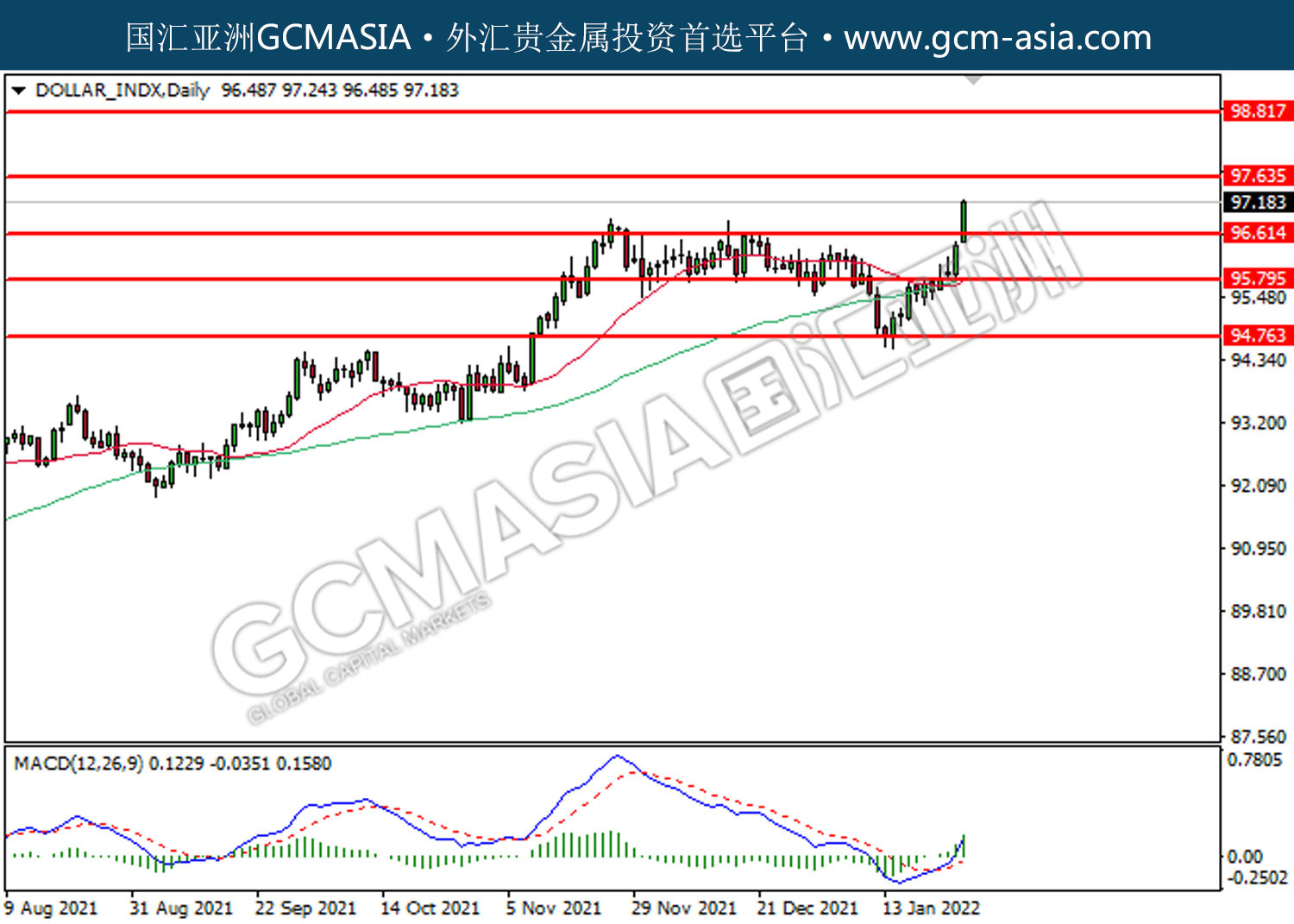 20220128 DOLLAR_INDX by willy | Jan 28, 2022 | 美元指数 | 0 comments DOLLAR_INDX,Daily:美指低位反弹。MACD已形成金叉,动能偏强,短期关注多头势力。上方关注97.65压力和98.80压力,下方关注96.60支撑和95.80支撑。