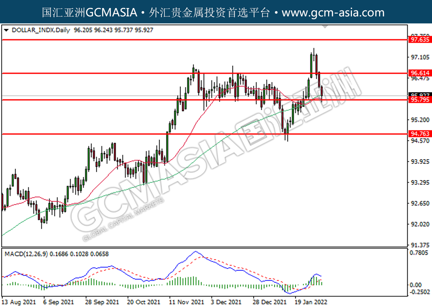 20220203 DOLLAR_INDX by willy | Feb 3, 2022 | 美元指数 | 0 comments DOLLAR_INDX,Daily:美指高位承压回落。MACD多头动能有所略减,若下破可继续看空。上方关注96.60压力和97.65压力,下方关注95.80支撑和94.75支撑。