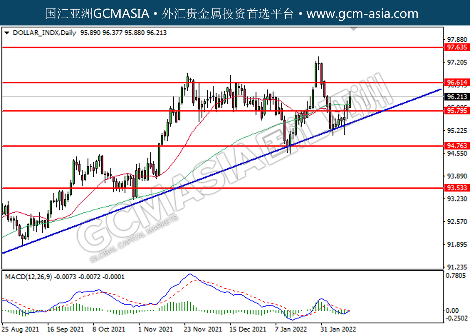 20220215 DOLLAR_INDX by willy | Feb 15, 2022 | 美元指数 | 0 comments DOLLAR_INDX,Daily:美指低位反弹。MACD空头动能有所略减,短期关注多头势力。上方关注96.60压力和97.65压力,下方关注95.80支撑和94.75支撑。