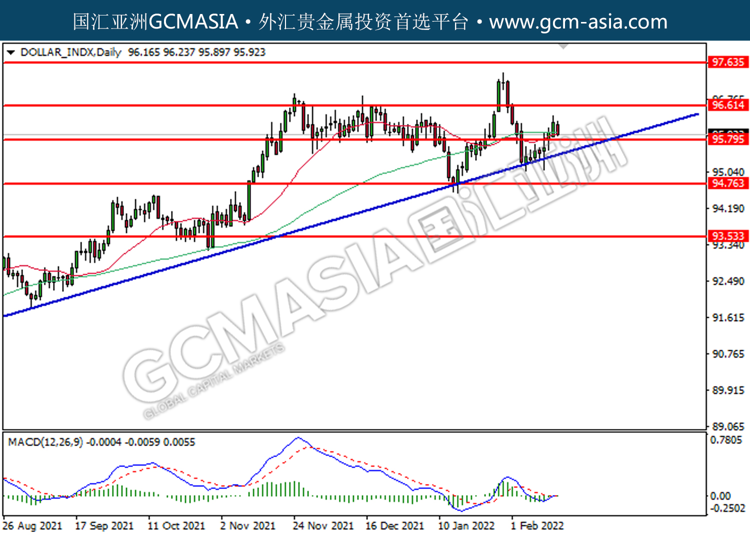 20220216 DOLLAR_INDX by willy | Feb 16, 2022 | 美元指数 | 0 comments DOLLAR_INDX,Daily:美指低位反弹。然而,MACD空头动能有所略增,短期关注空头势力。上方关注96.60压力和97.65压力,下方关注95.80支撑和94.75支撑。