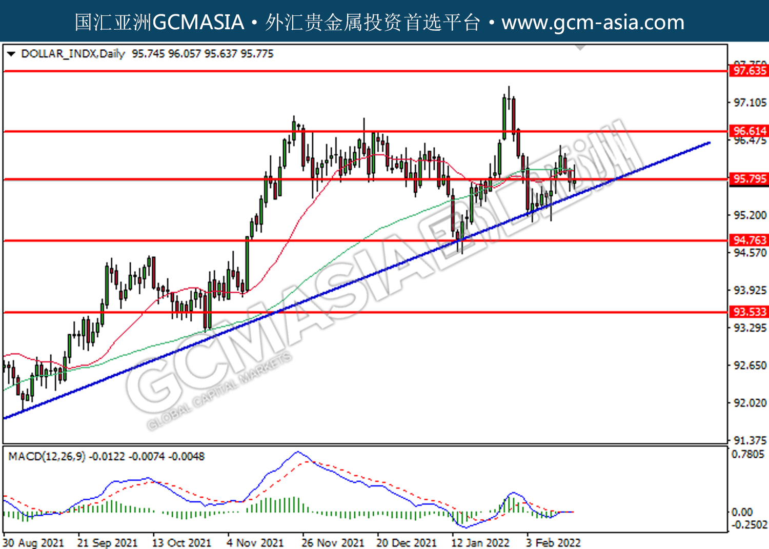 20220218 DOLLAR_INDX by willy | Feb 18, 2022 | 美元指数 | 0 comments DOLLAR_INDX,Daily:美指震荡下行。MACD空头动能有所略增,短期关注空头势力。上方关注95.80压力和96.60压力,下方关注94.75支撑和95.55支撑。