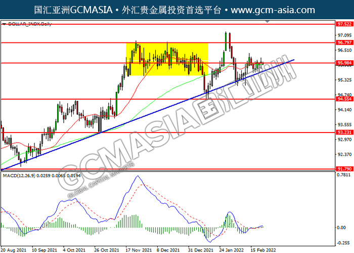 20220223 DOLLAR_INDX-午间 by willy | Feb 23, 2022 | 美元指数 | 0 comments DOLLAR_INDX,Daily:美指震荡上行,目前测试前期压力。MACD多头动能略增,短期可关注多头为主。上方关96.00压力和96.80压力,下方关注94.55支撑和93.25支撑。