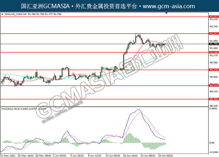 250621 DOLLAR_INDX by willy | Jun 25, 2021 | 美元指数 | 0 comments DOLLAR_INDX,H4:美指高位回落。然而,MACD空头动能略减,短期可关注技术性回调为主。上方关92.35压力和93.25压力,下方关注91.35支撑和90.35支撑。