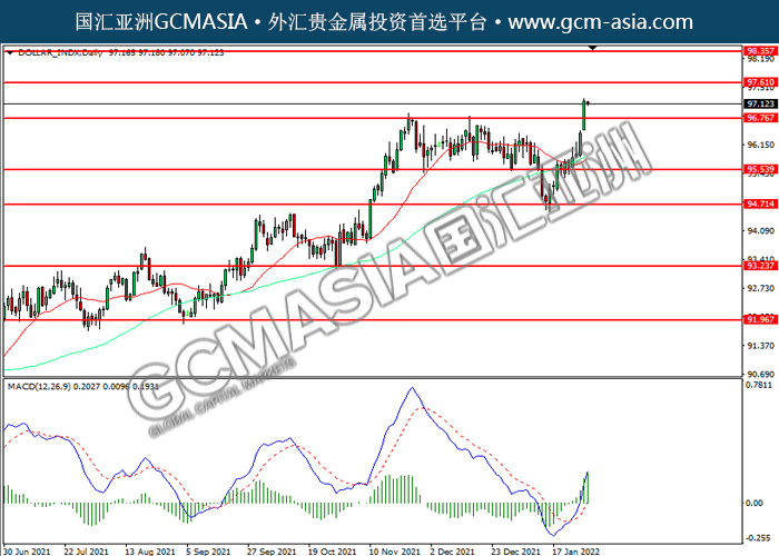 DOLLAR_INDX,Daily:美指低位反弹。MACD已形成金叉,动能偏强,短期关注多头势力。上方关注97.60压力和98.35压力,下方关注96.75支撑和95.55支撑。