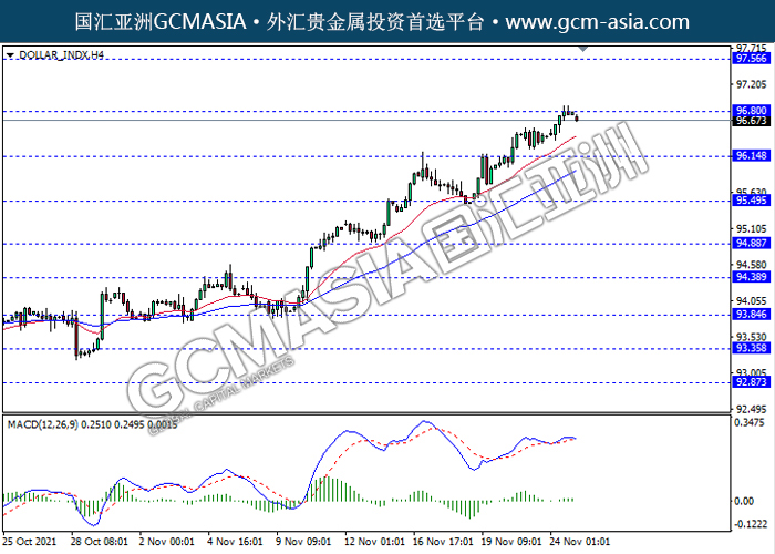 DOLLAR_INDX,H4:美指高位承压回落。MACD多头动能略减吗,短期继续看空回调为主。上方关注96.80压力和97.55压力,下方关注96.1 5支撑和95.50支撑。