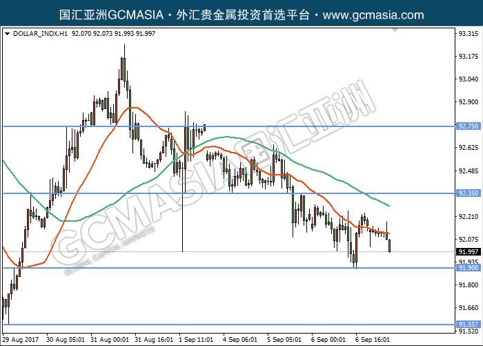 DOLLAR_INDX H1:美元指数处于下行趋势,目前下测低位支撑;均线空头排列,高位卖盘较强,保持看空。上方关注均线压力和92.35压力,下方关注91.90支撑和91.55支撑。