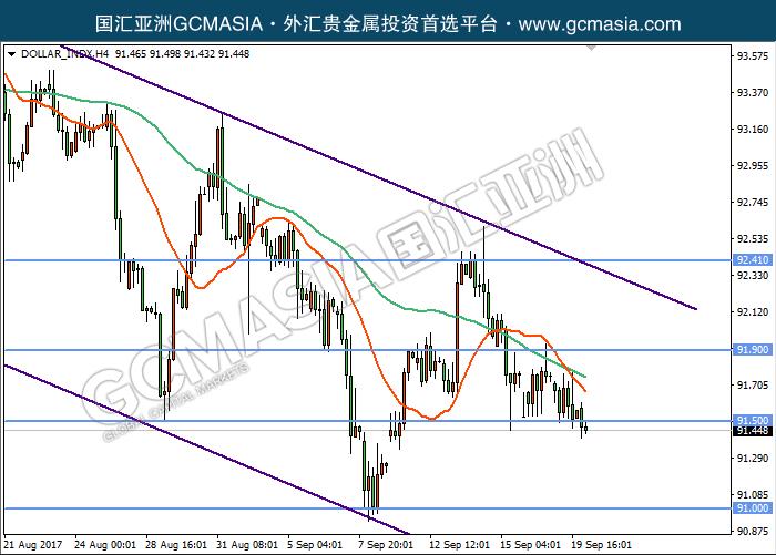DOLLAR_INDX H4:美元指数处于下行趋势,目前突破前低位支撑;均线高位压制,震荡偏弱,后市下行几率偏大。上方关注均线压力和91.50压力,下方关注91.00支撑。