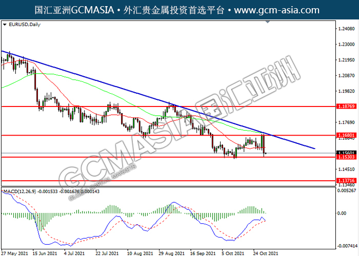011121 EURUSD by willy | Oct 31, 2021 | 欧元兑美元 | 0 comments EURUSD,Daily: 欧美震荡下行,目前测试前期支撑。MACD多头动能略减,若下破可关注空头为主。上方关注1.1680压力和1.1875压力,下方关注1.1530支撑和1.1370支撑。