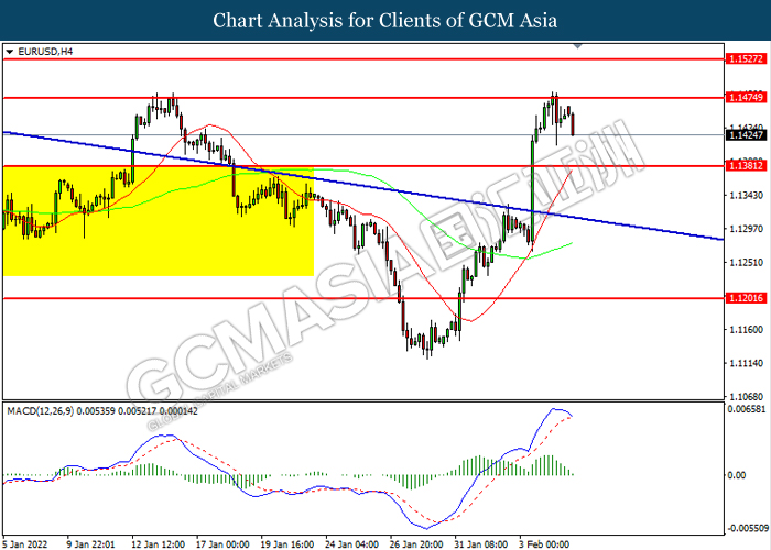 070222 EURUSD-午间 by willy | Feb 7, 2022 | 欧元兑美元 | 0 comments EURUSD, H4: 欧美高位回落。MACD多头动能略减,短期可关注空头为主。上方关注1.1475压力和1.1525压力,下方关注1.1380支撑和1.1200支撑。