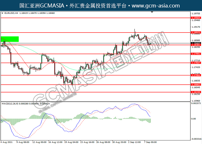 20210908 EURUSD by willy | Sep 8, 2021 | 欧元兑美元 | 0 comments EURUSD,H4: 欧美震荡下行,目前测试前期支撑。MACD空头动能略增,若下破可关注空头为主。上方关注1.1895压力和1.1955压力,下方关注1.1850支撑和1.1800支撑。