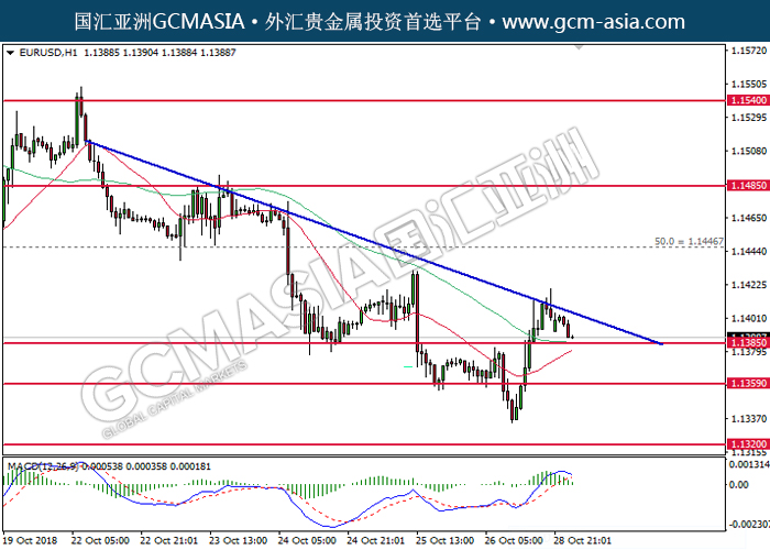 EURUSD,H1:欧美受承压回落,目前测试前期支撑。MACD多头动能略减,若突破可继续看空。上方关注1.1445压力和1.1485压力,下方关注1.1385支撑和1.1360支撑。