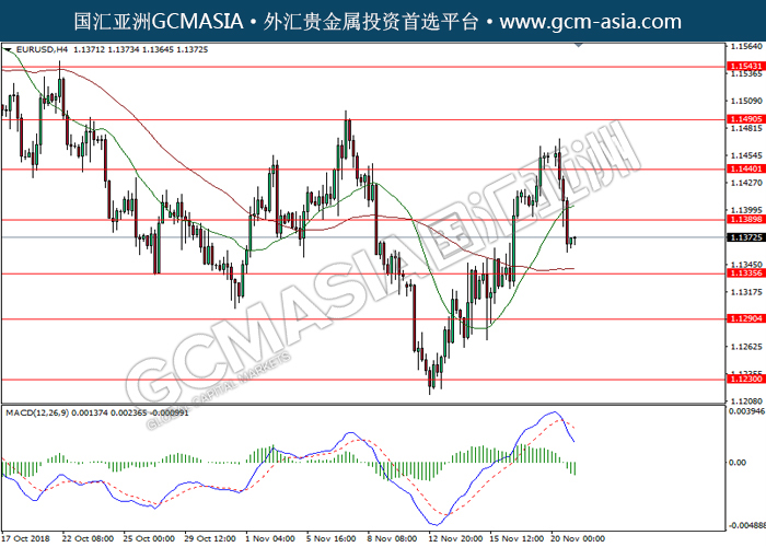 EURUSD,H4:欧美突破后持续下行。MACD形成死叉,动能略减,短期可关注空头为主。上方关注1.1390压力和1.1440压力,下方关注1.1335支撑和1.1290支撑。