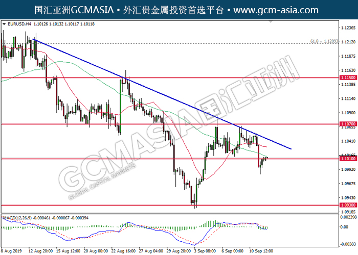 20190912 EURUSD by keyk | Sep 12, 2019 | 欧元兑美元 | 0 comments GCMAsia - EURUSD EURUSD 2019-09-12 EURUSD,H4:欧美低位反弹。MACD空头动能有所略减,短期关注多头回调。上方关注1.1070压力和1.1150压力,下方关注1.1010支撑和1.0930支撑。