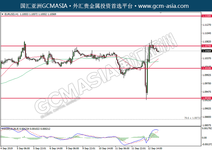 20190913 EURUSD by keyk | Sep 13, 2019 | 欧元兑美元 | 0 comments GCMAsia - EURUSD EURUSD 2019-09-13 EURUSD,H1:欧美受承压回落。MACD 多头动能有所略减,短期关注技术性回调。上方关注1.1070压力和1.1150压力,下方关注1.1010支撑和1.0930支撑。