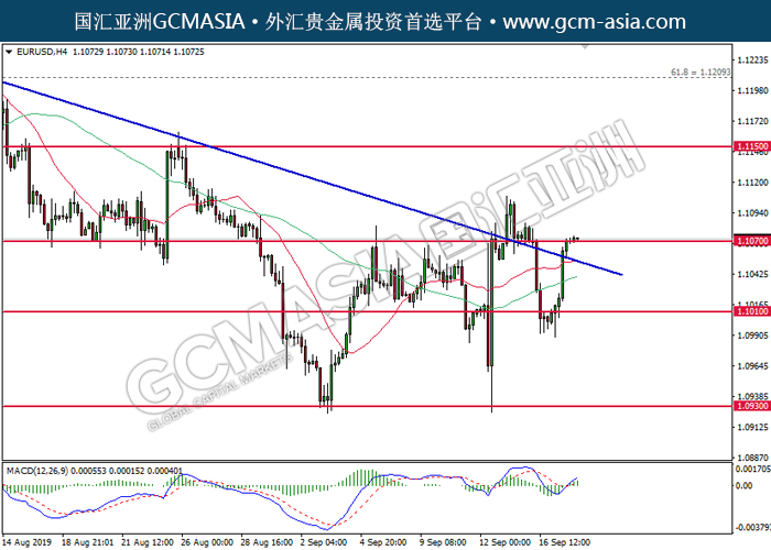 EURUSD,H4:欧美近期突破下行趋势线。MACD已形成金叉,动能偏强,中期关注多头势力为主。上方关注1.1150压力和1.1210压力,下方关注1.1070支撑和1.1010支撑。