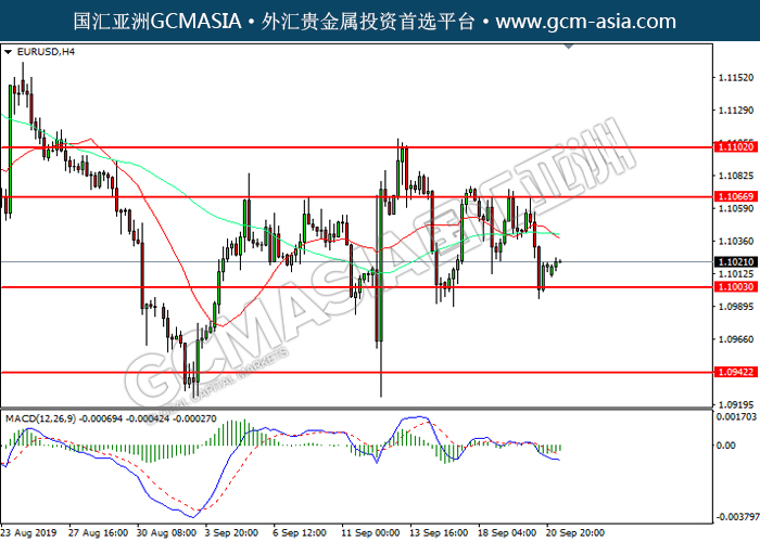 20190923 EURUSD-午间 by skylow | Sep 23, 2019 | 欧元兑美元 | 0 comments GCMAsia - EURUSD EURUSD 2019-09-23 EURUSD,H4:欧美低位反弹。MACD空头动能有所略减,短期关注多头反弹。上方关注1.1065压力和1.1100压力,下方关注1.1005支撑和1.0940支撑。