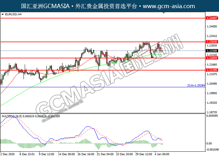 20200105 EURUSD by willy | Jan 5, 2021 | 欧元兑美元 | 0 comments GCMAsia-EURUSD EURUSD 2021-01-05 EURUSD,H4:欧美震荡下行。然而,MACD空头动能略减,短期可关注技术性回调。上方关注1.2305压力和1.2450压力,下方关注1.2205支撑和1.2130支撑。