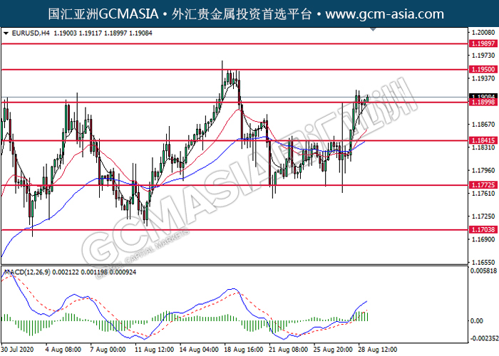 EURUSD,H4:欧美突破后持续上行。然而,MACD多头动能转弱,短期可关注技术性回调为主。上方关注1.1950压力和1.1990压力,下方关注1.1900支撑和1.1840支撑。