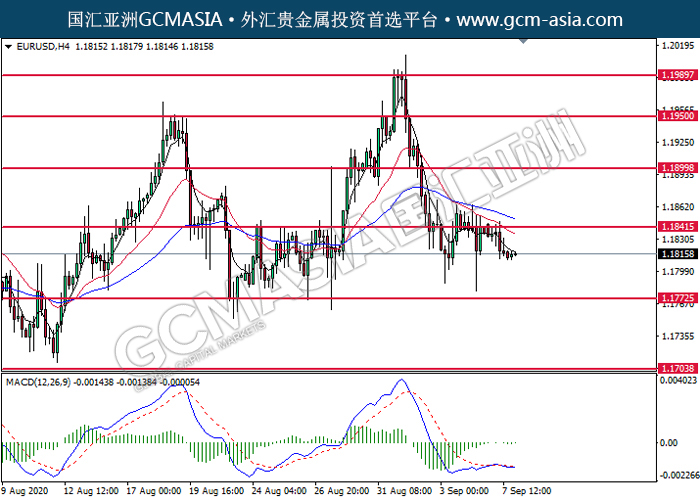 EURUSD,H4:欧美高位承压后回落。由于MACD并没有显示任何信号,建议等到更多信号出现后才进入市场。上方关注1.1840压力和1.1900压力,下方关注1.1775支撑和1.1705支撑。