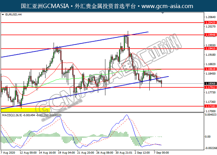EURUSD,H4:欧美震荡下行,目前靠近前期支撑。MACD空头动能有所略增,若下破可关注空头为主。上方关注1.1860压力和1.1940压力,下方关注1.1790支撑和1.1720支撑。