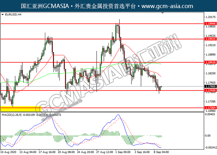 EURUSD,H4:欧美震荡下行,目前测试前期支撑。然而,MACD空头动能有所略减,短期可关注技术性回调为主。上方关注1.1860压力和1.1940压力,下方关注1.1765支撑和1.1705支撑。