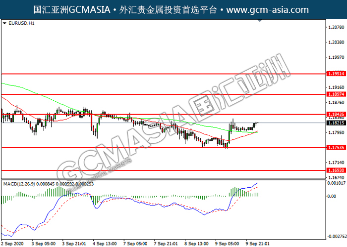 EURUSD,H1:欧美震荡上行,目前靠就前期压力。MACD多头动能有所略增,若突破可关注多头为主。上方关注1.1845压力和1.1895压力,下方关注1.1755支撑和1.1695支撑。