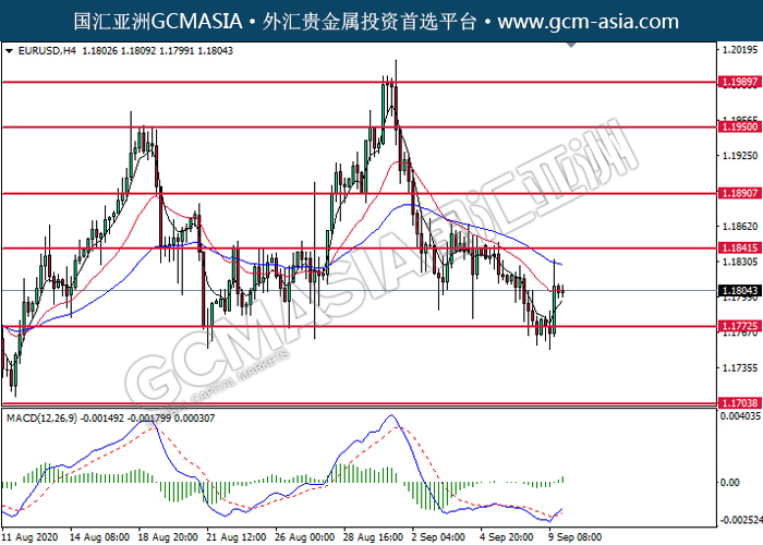 20200910 EURUSD by willy | Sep 10, 2020 | 欧元兑美元 | 0 comments GCMAsia-EURUSD EURUSD 2020-09-10 EURUSD,H4:欧美低位反弹。MACD显示多头信号,短期可持续关注多头为主。上方关注1.1840压力和1.1890压力,下方关注1.1775支撑和1.1705支撑。