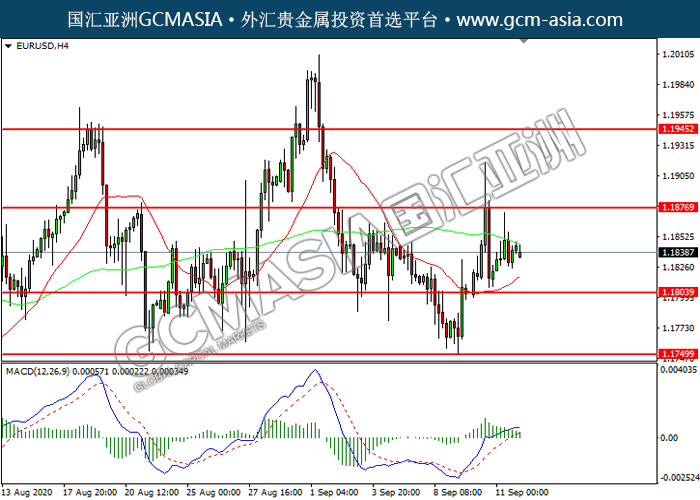 20200914 EURUSD by willy | Sep 14, 2020 | 欧元兑美元 | 0 comments GCMAsia-EURUSD EURUSD 2020-09-14 EURUSD,H4:欧美低位反弹。然而,MACD多头动能有所略减,短期可关注技术性回调为主。上方关注1.1875压力和1.1945压力,下方关注1.1805支撑和1.1750支撑。