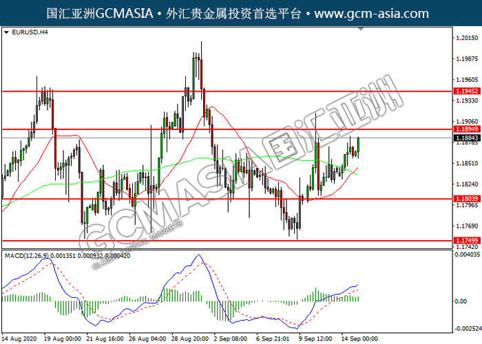 EURUSD,H4:欧美震荡上行,目前靠就前期压力。MACD多头动能有所略增,若突破可关注多头为主。上方关注1.1895压力和1.1945压力,下方关注1.1805支撑和1.1750支撑。